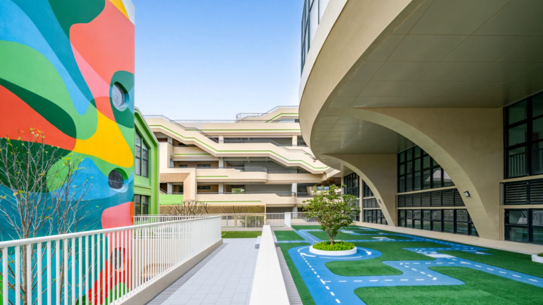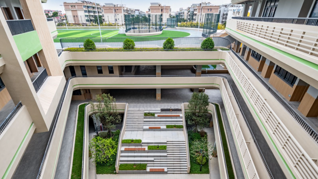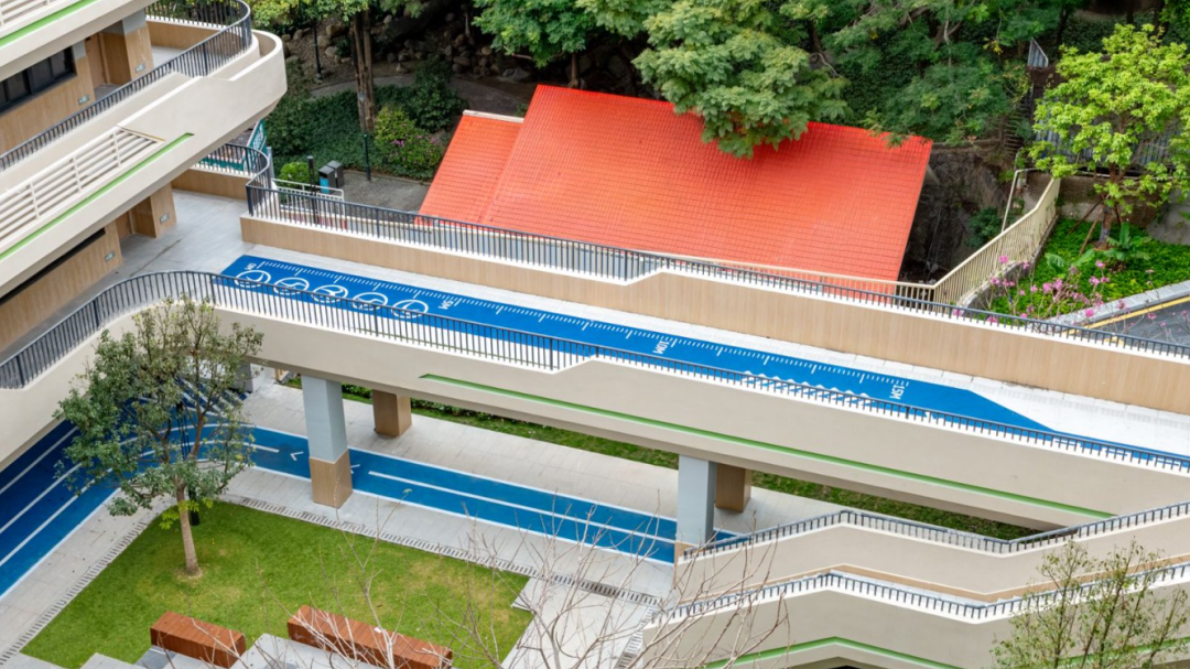 建設(shè)過程中,項目團隊創(chuàng)新采用“垂直生長、功能疊加”的“3D校園”模式,實現(xiàn)土地高效利用。校園空間依山就勢,通過建筑扭轉(zhuǎn)與運動場架空的設(shè)計手法,將空中跑道、屋頂花園、觀景平臺串聯(lián),打造與自然融為一體的現(xiàn)代化校園。